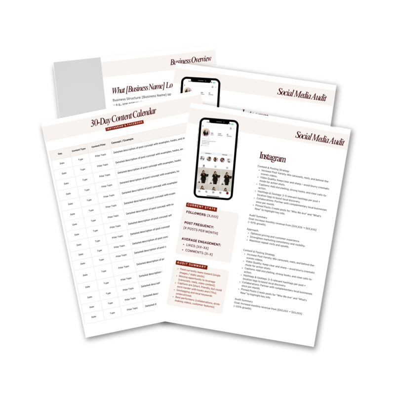 You’ll receive a tailored, actionable playbook with audits, recommendations, lead generation ideas, and a 30-day content calendar you can start using immediately.